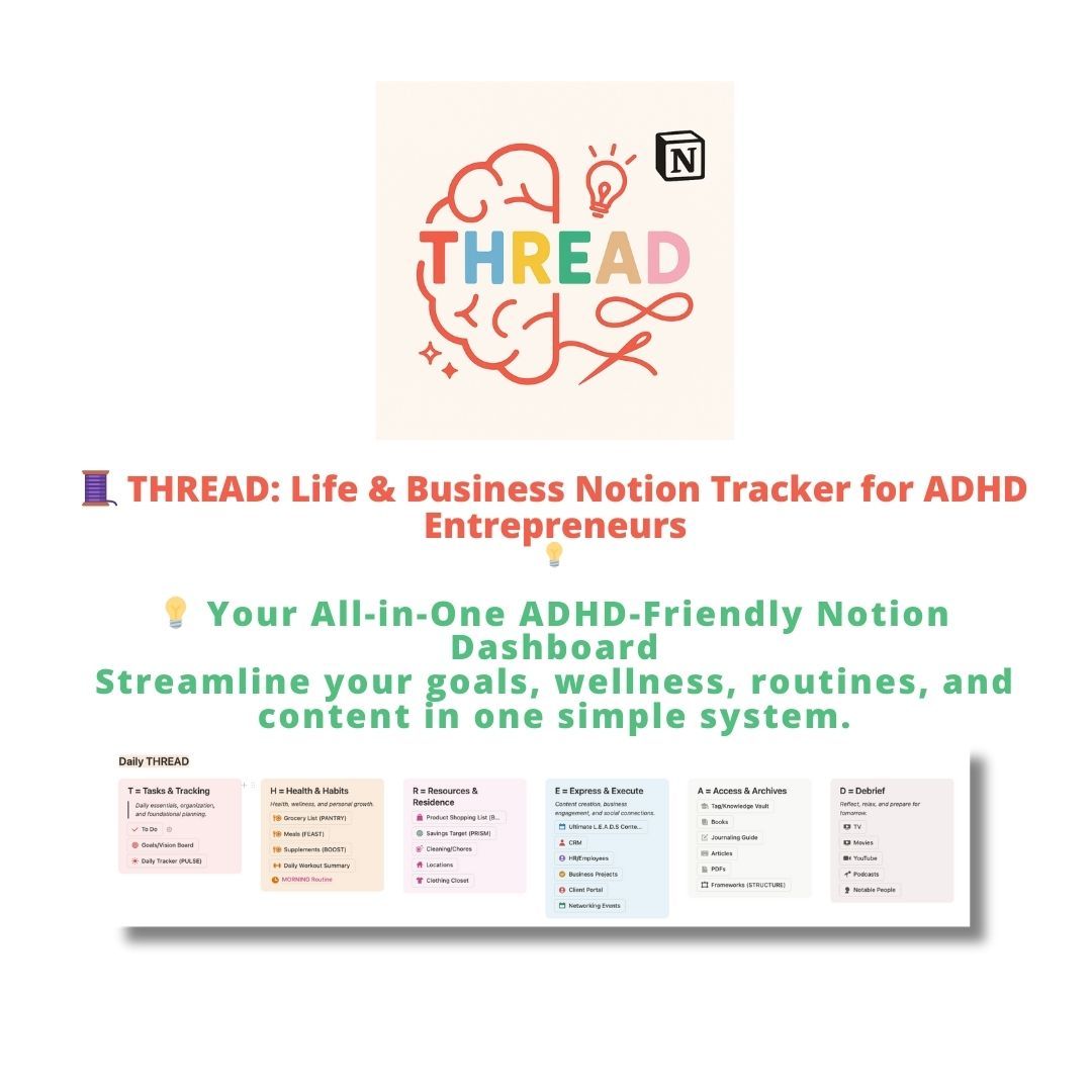 THREAD is a Notion-based daily dashboard that helps ADHD entrepreneurs manage their entire life in one place—from to-dos and health routines to business content and reflections. It complements the DAILY F.L.O.W. system by going deeper into core pillars of organization—with custom acronyms, color-coded systems, and specialized databases for every part of your brain. This is more than a planner. It’s a living system that grows with you. 🔠 What THREAD Stands For: T = Tasks & Tracking Your daily foundation: T.A.S.K. (color-coded priority system)ACE GoalsDaily PULSE TrackerBUYIT (shopping list)PRISM (savings + purchases) H = Health & Habits Your mind & body regulation tools: BOOST (supplements log)FEAST & PANTRY (meals + groceries)Hormones, Cycle logs, Sleep, MovementMorning/Evening RoutinesBiohacking & Mental Health tools R = Resources & Residence Your physical world & lifestyle clarity: CLOSET (style planner)LOCATE (item finder)CHARM (aesthetics, people, inspo)PRISM (linked again for purchases)Dream Home, Gift Lists, Lifestyle plans E = Express & Execute Your creative work & business operations: YouTube / PodcastSubstackContent CalendarYOU WIN (CRM system)Projects DashboardCall Logs & Collaboration Notes A = Access & Archives Your long-term brain extension: TAG/Knowledge BaseArticles, PDFs, ResourcesSTRUCTURE (frameworks)SOPs, Swipe Files, DownloadsNotion Templates & Tools D = Debrief Your end-of-day wrap-up & reflection hub: The Gift (daily gratitude)Journaling LogsMedia Tracker (TV, Movies, Podcasts)Monthly Wins & MoodLookbacks, Future Logs ❤️ Why You’ll Love THREAD Color-coded clarity across all dashboardsFully integrated acronyms and database namingCustom-made for ADHD entrepreneurs who juggle content, creativity, and chaosA system that feels fluid, not forcedBuilt to complement your DAILY F.L.O.W., but can also stand alone 🚀 Ready to Organize Everything in One Place? Grab the THREAD System and start building a digital rhythm that supports your entire life—with clarity, structure, and room to breathe. 🎥 Comes with: Video walkthroughsFacebook communityLifetime updates 🧠 Your brain will thank you. ✳️ Due to the digital nature of this product, refunds are not available.