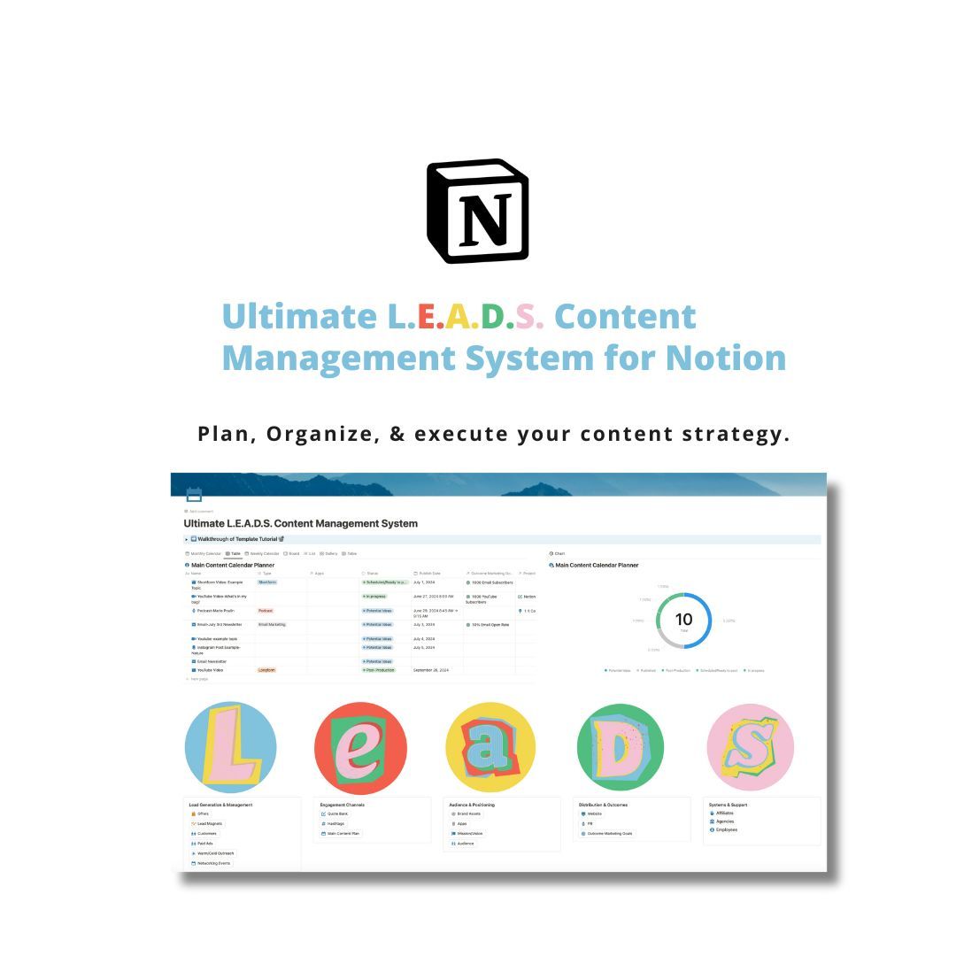 Introducing the Ultimate L.E.A.D.S. Content Management System for Notion Revolutionize how you plan, organize, and execute your entire content marketing strategy. Designed with the power and flexibility of the L.E.A.D.S. Framework, this Notion template equips you with everything you need to build a cohesive, organized, and results-driven approach to content creation and marketing. Unlock Complete Access with the Notion Foundations All Access Bundle Along with the L.E.A.D.S. Content Management System, get access to all of my Notion templates, two in-depth courses (Notion Foundations and Notion Template Creator). Upgrade Your Productivity Today https://notionfoundations.com/ Who Is This For? Whether you’re a blogger, social media marketer, content creator, or agency owner, the L.E.A.D.S. Content Management System will keep you organized, on track, and focused. Manage your content calendar, set campaign goals, streamline workflows, and maintain a strong brand identity, all within Notion! What’s Inside the L.E.A.D.S. Content Management System? Each element of this template is carefully structured around the L.E.A.D.S. Framework: L - Lead Generation & Management • Offers: Store and organize all your business offers, promotional content, and calls to action in one place. • Lead Magnets: Track and manage your lead magnets to attract new customers consistently. • Warm & Cold Outreach: Plan and record your outreach efforts, from email campaigns to potential collaborations. • Networking: Keep a record of connections, events, and potential partnerships to grow your influence. • CRM/Contacts: Access a built-in CRM for tracking clients and contacts, allowing for smooth communication and relationship-building. E - Engagement Channels • Content: Organize your main content pillars and daily themes for consistent, aligned messaging across platforms. • Social Media Marketing: Plan and schedule social media content, ensuring your brand is visible and active. • Content Planning: Map out long-form content like podcasts, YouTube videos, and blogs in a single calendar. • Content Buckets: Group content ideas by categories, such as blog posts, videos, or social posts, to cover all aspects of your strategy. • Writing: Organize and store drafts and templates for all your written content, from social captions to emails. A - Audience & Positioning • Brand/Positioning: Maintain essential brand elements like mission statements, target audience, and core messaging. • Brand Assets: Centralize all visual assets (logos, colors, fonts) for easy access, ensuring brand consistency. • Audience: Define and update your target audience demographics to guide your messaging. • Networking for Brand Building: Track opportunities to build relationships that enhance your brand’s reputation and reach. D - Distribution & Outcomes • Outcome Marketing Goals/Campaigns: Define and monitor your marketing goals and campaigns to stay focused. • Website: Manage web content updates and ensure your online presence aligns with campaign goals. • PR: Track public relations efforts to boost brand awareness. • Affiliates & Agencies: Organize partnerships and affiliations for expanded reach. • Customer Success: Log client interactions and feedback, ensuring your audience has an excellent experience with your brand. S - Systems & Support • Apps: Access a curated list of tools to optimize productivity, from design software to CRM tools. • Client CRM: Built-in database to track client details and streamline your communication. • Team Management: Outline employee roles, responsibilities, and team tasks to keep projects organized. • Marketing Resources Database: Find marketing templates, guides, and tutorials to enhance content quality. Why Choose the L.E.A.D.S. Content Management System? • Stay Organized: Keep all content ideas, campaigns, and brand assets in one centralized, easy-to-navigate space. • Enhance Efficiency: Reduce time spent searching for information and focus on content creation. • Achieve Consistency: Align all your content across platforms, ensuring a seamless experience for your audience. • Track Results: Keep your marketing goals front and center, so every piece of content has a clear purpose. Please Note: Due to the digital nature of this product, we are unable to offer refunds. Ready to Simplify Your Content Marketing Strategy? Get the Ultimate L.E.A.D.S. Content System Now!